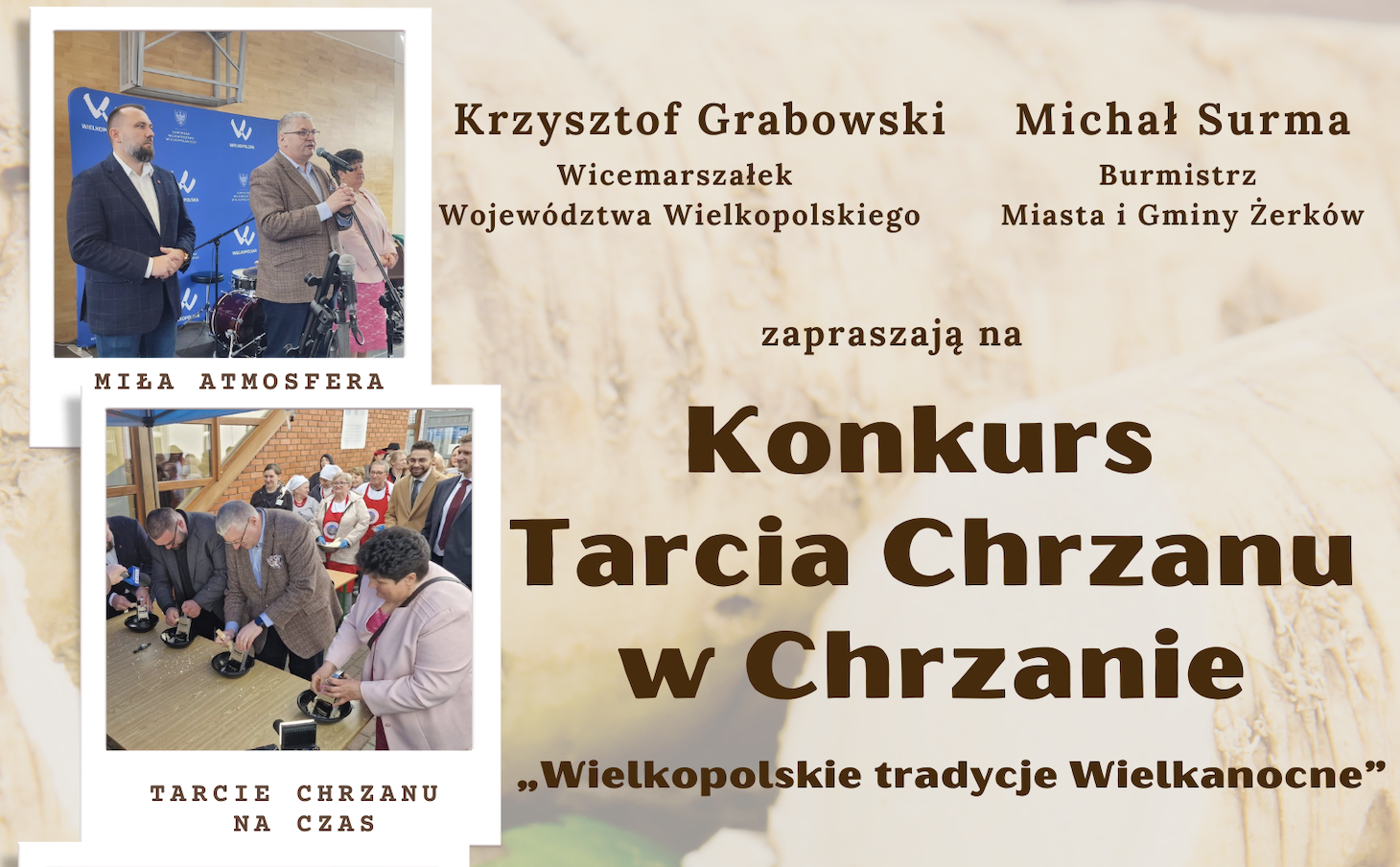 Czwarta edycja konkursu „Tarcia chrzanu w Chrzanie – Wielkopolskie Tradycje Wielkanocne” organizowana przez Zarząd Województwa Wielkopolskiego razem z Gminą Żerków to okazja do poznania nowych smaków, promocji lokalnych tradycji i przysmaków. Organizacja konkursu ma na celu populację chrzanu ale także licznych zwyczajów świątecznych i kulinarnych symboli związanych z Wielkanocą. Konkurs jest również inspiracją młodych pokoleń do czerpania z dziedzictwa przodków i aktywnego udziału w życiu lokalnych organizacji i społeczności. Wielu emocji dostarczy rywalizacja w konkurencji tarcia chrzanu na czas, która pokazuje ze uczestnicy konkursu oprócz talentu kulinarnego muszą dużą siłą i kondycją. Zgłoszenia dla KGW przyjmowane są do 20 marca. – mówi Wicemarszałek Województwa Wielkopolskiego Krzysztof Grabowski