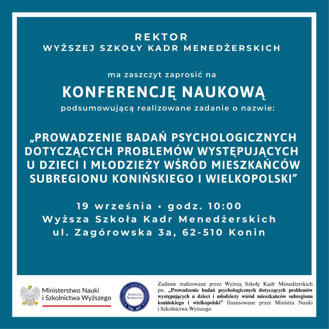 19 września 2025 r. o godz. 10:00 w Wyższej Szkole Kadr Menedżerskich w Koninie odbędzie się konferencja podsumowująca projekt: