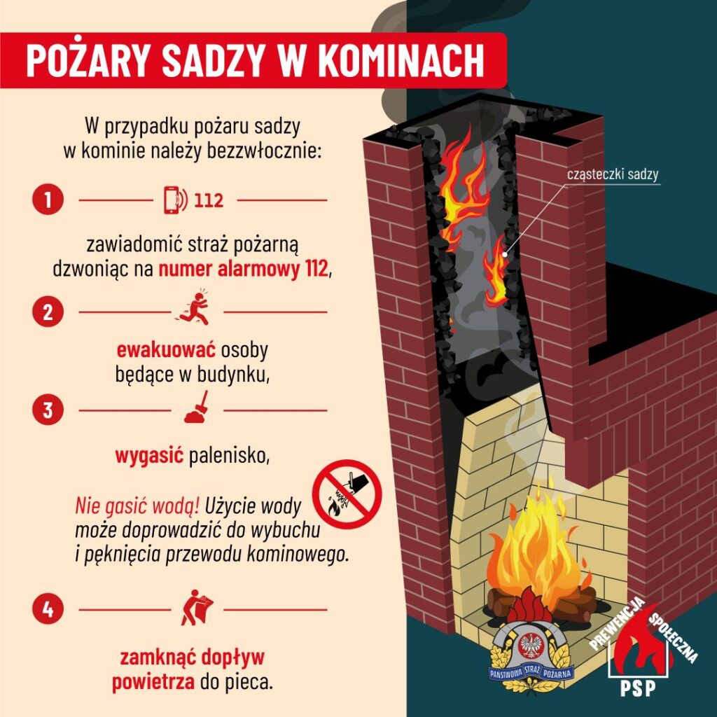 W okresie od 24 grudnia 2025 r. do 8 stycznia 2026 r. odnotowaliśmy 11 pożarów sadzy w przewodach kominowych, które miały miejsce w prywatnych budynkach mieszkalnych. W większości przypadków prawdopodobną przyczyną powstania tych pożarów była nieprawidłowa eksploatacja urządzeń ogrzewczych na paliwo stałe. Paląca się w wysokich temperaturach sadza często powoduje pękanie komina, a przez to powstają nieszczelności w przewodzie kominowym, którymi ogień lub wysoka temperatura wyjdzie na zewnątrz, dokonując zapalenia materiałów na poddaszu, czy w pomieszczeniach na niższych kondygnacjach, przylegających bezpośrednio lub pośrednio do komina. Ponadto nieszczelne przewody kominowe mogą być źródłem przedostawania się czadu do pomieszczeń użytkowanych przez ludzi.